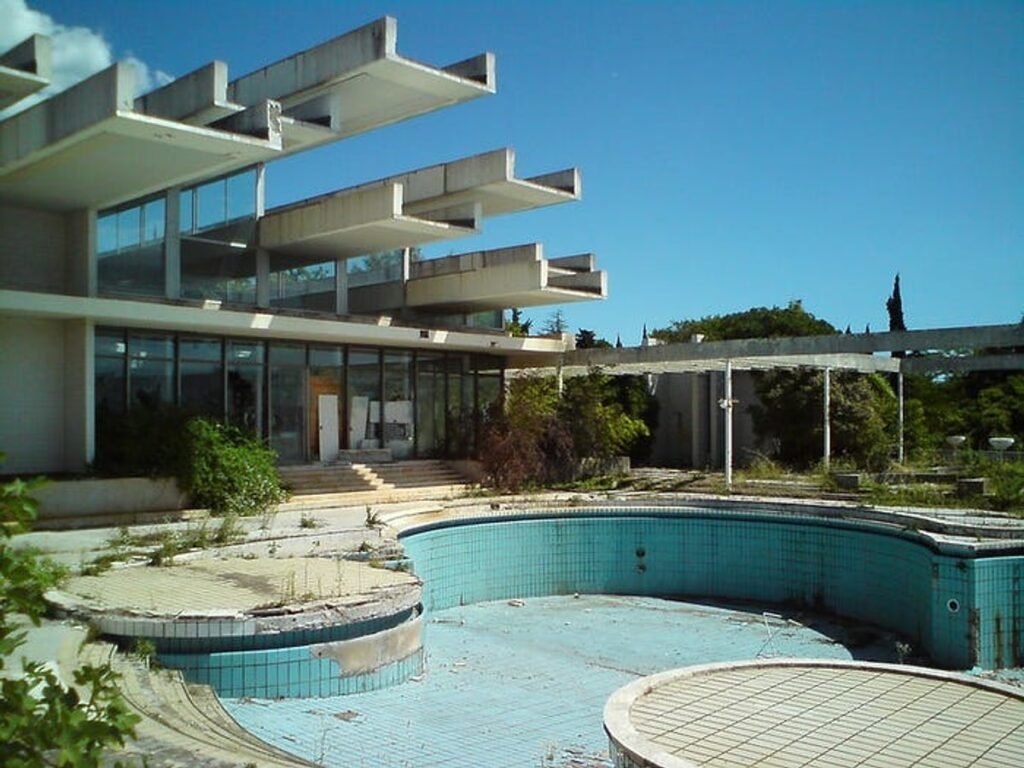 Bir diğer örnek de Krk Adası’ndaki Haludovo Palace Oteli. Burası zamanında çok lüksmüş, hatta içinde kumarhane bile varmış. Zengin turistler buraya gelirmiş. Ama bugün otelin içi tamamen boş, havuzu bakımsız ve her yer yıkık durumda.